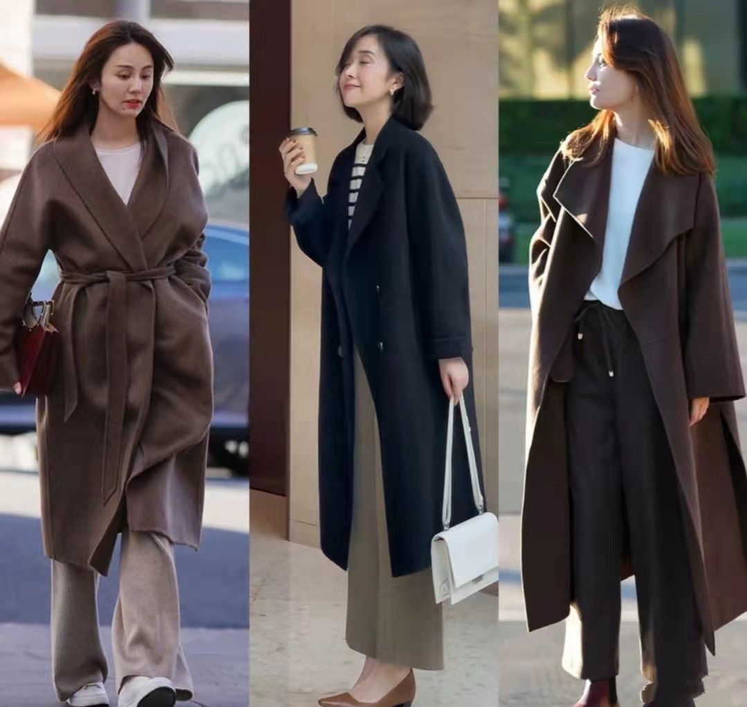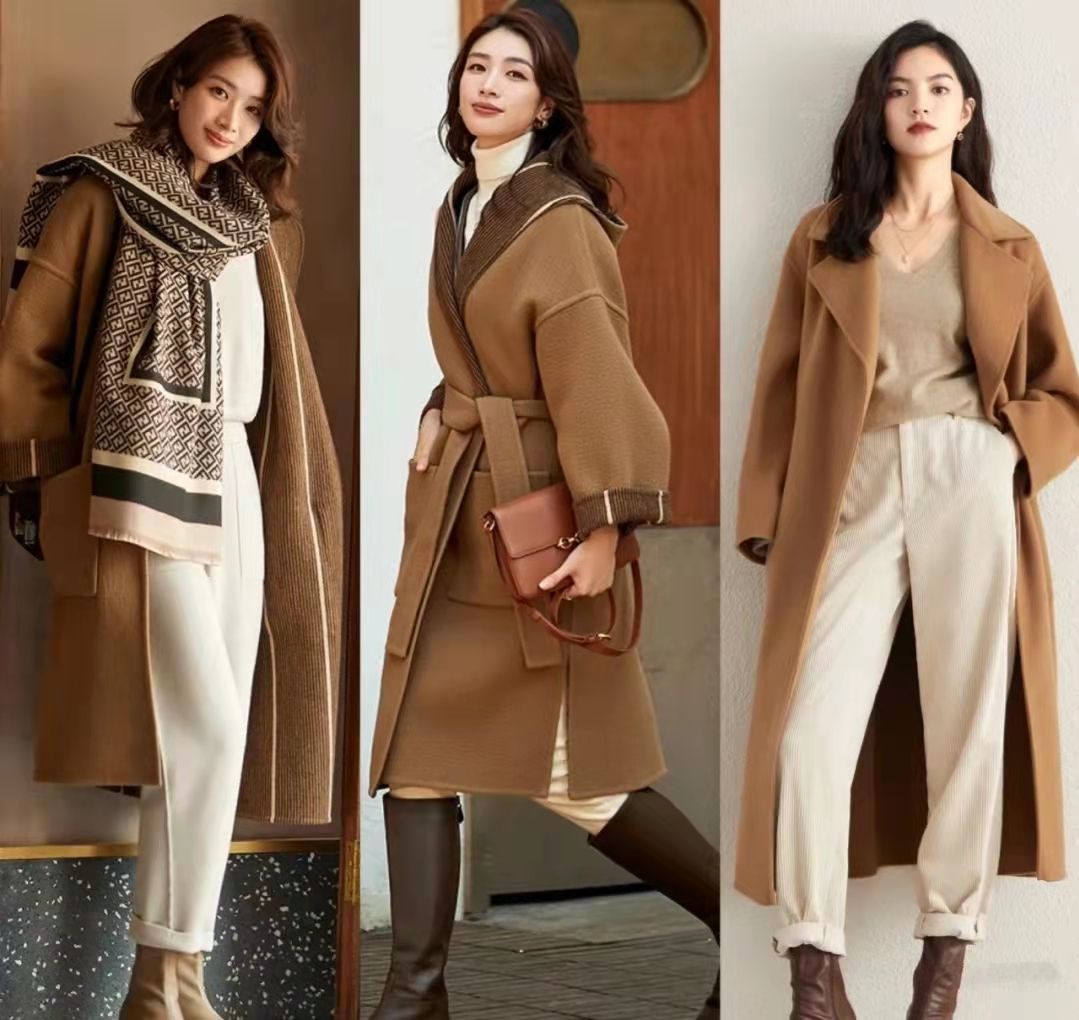 这里有个细节要注意,内搭下装采用同色系搭法时,颜色最好比大衣浅一点,例如用驼色大衣配米色打底衫,干净高级。
